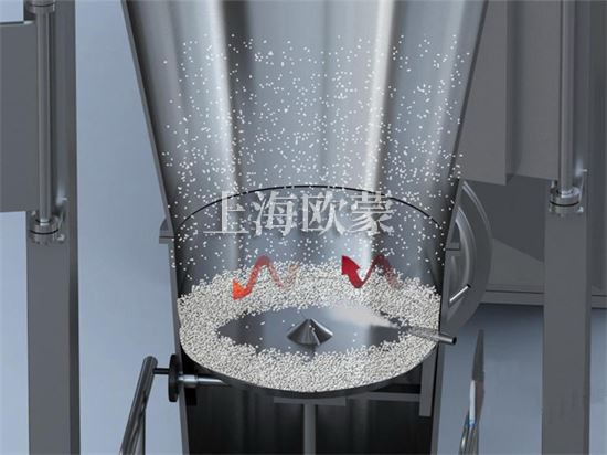 空氣經加熱凈化后,由引風機從下部導入,穿過料斗的孔網板。在工作室內,經攪拌和負壓作用形成流態化,水份快速蒸發后隨著排氣帶走,物料快速干燥。